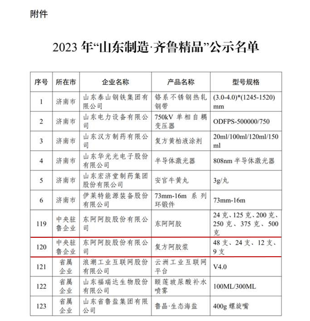 近日,山東省工信廳公示了2023年“山東制造·齊魯精品”名單,全省共有123項產(chǎn)品入選。其中,公司東阿阿膠和復(fù)方阿膠漿兩項產(chǎn)品成功入選,本公司也是全省唯一入圍兩項產(chǎn)品的企業(yè)!