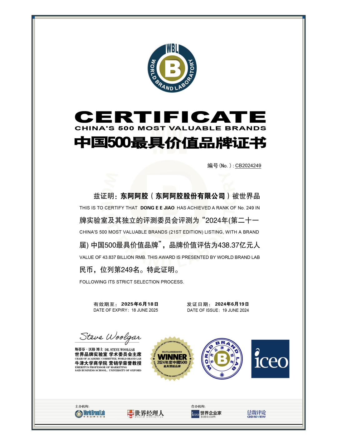 6月19日,由世界品牌實驗室(World Brand Lab)主辦的第21屆“世界品牌大會”在北京舉行,會上發(fā)布了2024年《中國500最具價值品牌》分析報告。在這份基于財務(wù)數(shù)據(jù)、品牌強度和消費者行為分析的年度報告中,東阿阿膠以438.37億元人民幣的品牌價值位列《中國500最具價值品牌》榜單第249位,品牌價值較去年增長了13%。